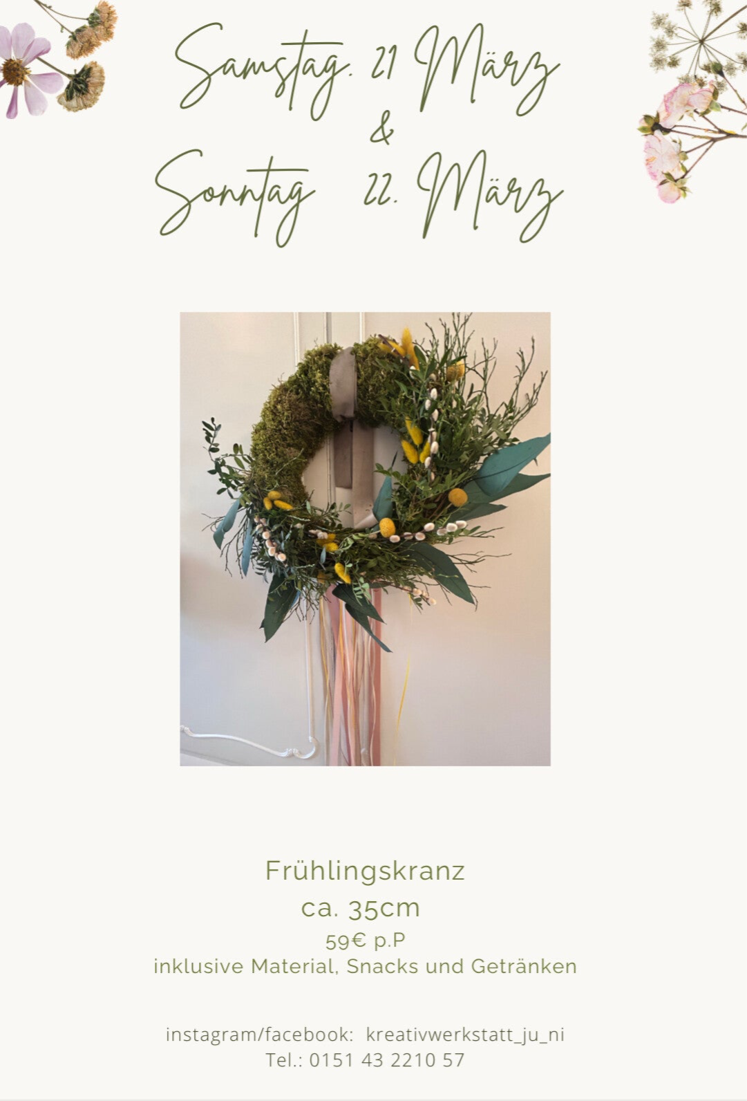 In einer gemütlichen Atmosphäre lernst du, wie man einen Haarkranz bindet oder wir gestalten gemeinsam einen Türkranz passend zur Jahreszeit.